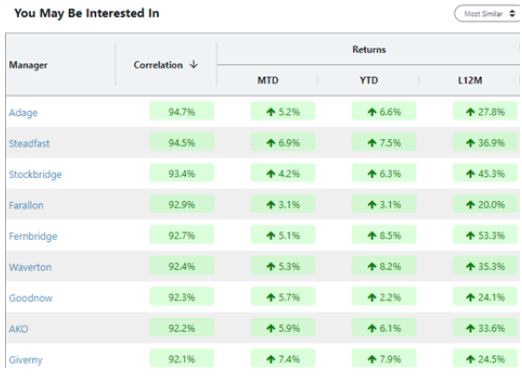 We also added a table to the dashboard where users can quickly see the most and least correlated managers to the manager in question based on OWL’s return estimates. Below is an example, again for Hound Partners: