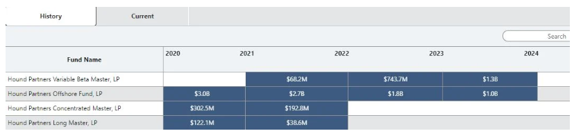 For example, in the table below, you can see that Hound Partners closed two vehicles in 2021 and has significantly grown the "Hound Partners Variable Beta Master" fund in recent years.