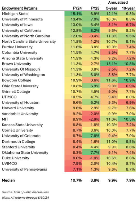 The table below shows returns for the schools that have reported FY24 numbers so far. Several big names, including Yale, WashU, Princeton, and Notre Dame, haven’t weighed in yet, but are likely to be near the top in terms of long-term performance.