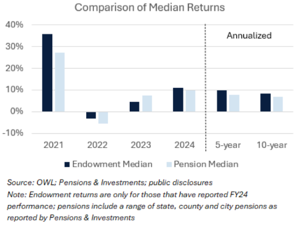 It looks like endowments will once again outperform pensions for FY24, after a rare year in FY23 when the median pension outperformed the median endowment: