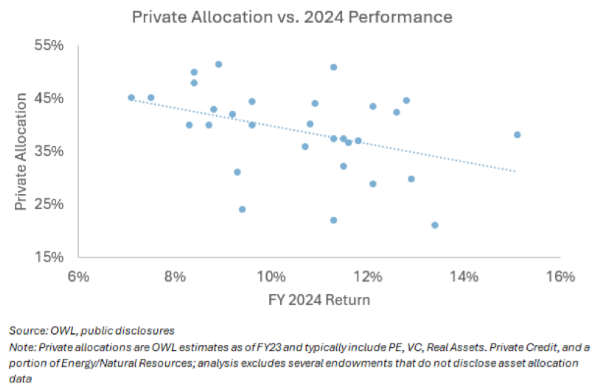 Given the strong performance in public markets over this period (S&P +25%; ACWI +20%), it’s no surprise that endowments with more exposure to public equity outperformed. Michigan State, the best performing endowment for FY24 thus far, is a good example of this, with nearly 40% of their endowment invested in global equities, with most of that in passive and index-like exposure. OWL users can see Michigan State’s entire portfolio here.