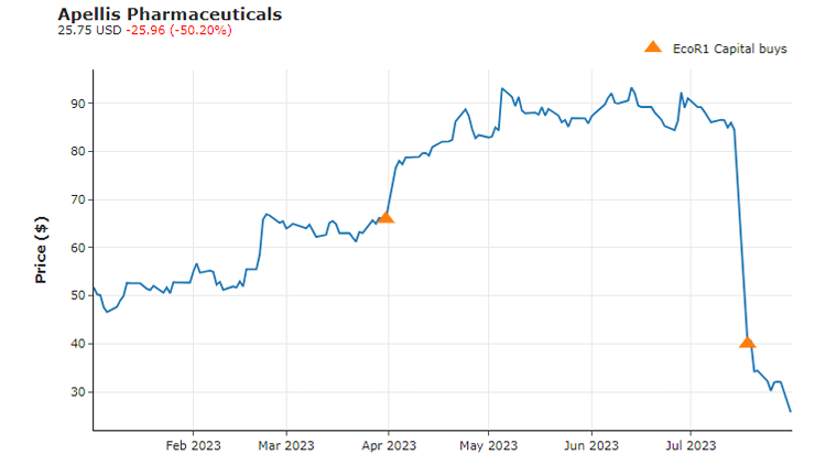 One recent example is EcoR1’s position in Apellis Pharma. The company gained approval earlier this year for Syfovre, a drug that treats an eye disease called geographic atrophy. In mid-July, the American Society of Retina Specialists reported that six recipients of the new drug experienced inflammation in their eyes, causing the stock to quickly fall by more than half on July 17th and 18th. EcoR1, which previously owned 4.7% of Apellis, quickly disclosed that it bought more shares of Apellis on the 18th in a filing that came out that same day.