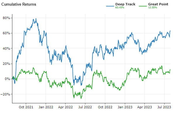 OWL’s people data can also be used to track spinouts and new launches. One example in biotech is David Kroin, who launched Deep Track Capital in 2020 after serving as Managing Director at Great Point Partners. Deep Track’s disclosed positions since launch have significantly outperformed Great Point’s, which you can see below. Custom charts like this can be easily created using OWL’s reports builder found on each manager page.