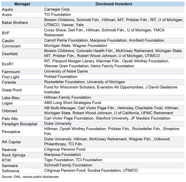Biotech managers have been popular among the allocator community. The table below shows a selection of publicly disclosed LPs for each manager. OWL’s allocator database now tracks almost 1,500 allocators; users can see the latest information and disclosures in OWL's allocators section .