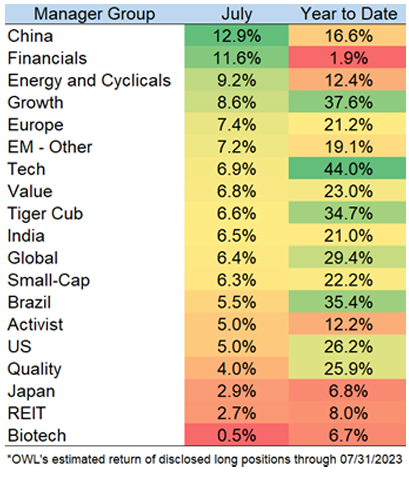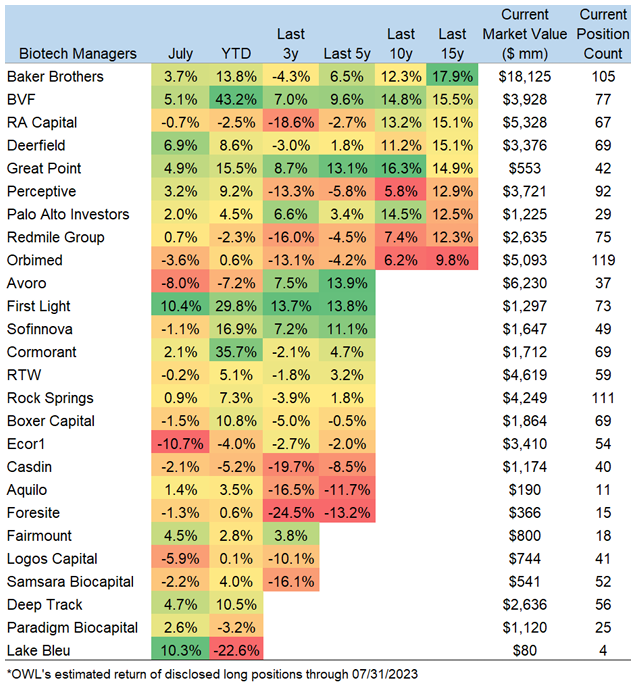 Biotech managers were at the bottom in July, driven by stock-specific moves that caused managers such as Octagon (-20%), EcoR1 (-11%), Avoro (-8%), and Orbimed (-4%) to have losses. As a reminder, all performance numbers are estimates of each manager’s publicly disclosed long positions and are updated daily on the OWL Platform .