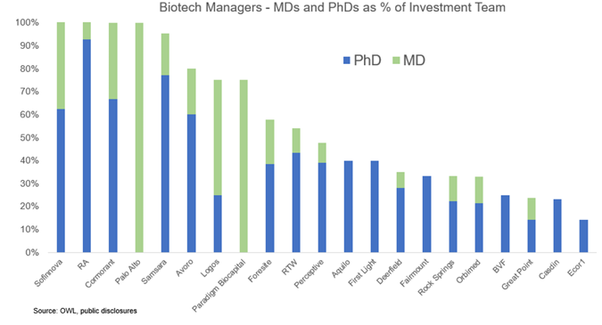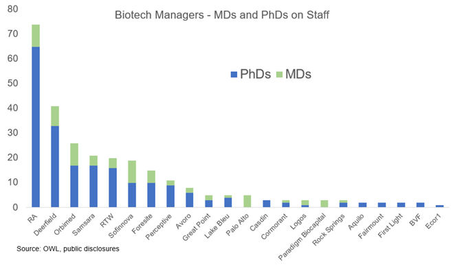 A significant focus for the OWL data and engineering team is improving the quality of our people data and analysis - we have several exciting updates coming in the next few months. In the table below, we utilize our people data to analyze how many PhDs or MDs are on the staff of each biotech manager.