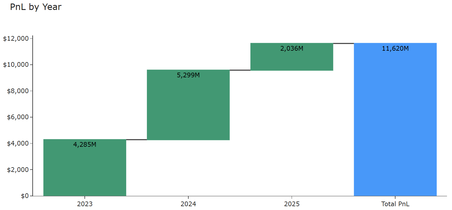 Today, Newlands manages a disclosed public equity portfolio worth nearly $18 billion, with billion-dollar-plus positions in Meta, Amazon, Tesla, DoorDash, Robinhood, and Alphabet. OWL estimates that two-thirds of this $18 billion stems from gains over the past few years, with over $5 billion in profit from Meta alone: