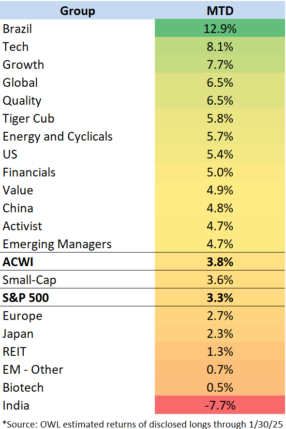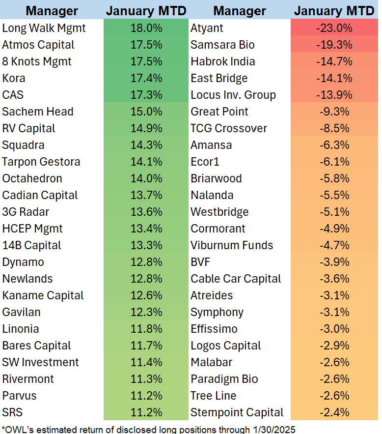 Below is a selection of managers whose disclosed positions have had the best and worst performance month-to-date. Several tech-focused managers (Long Walk, Kora, CAS, Octahedron) and Brazil-based funds (Atmos, Squadra, Tarpon, 3G Radar) were among the top performers, while the worst performers were primarily India- and Biotech-focused funds.