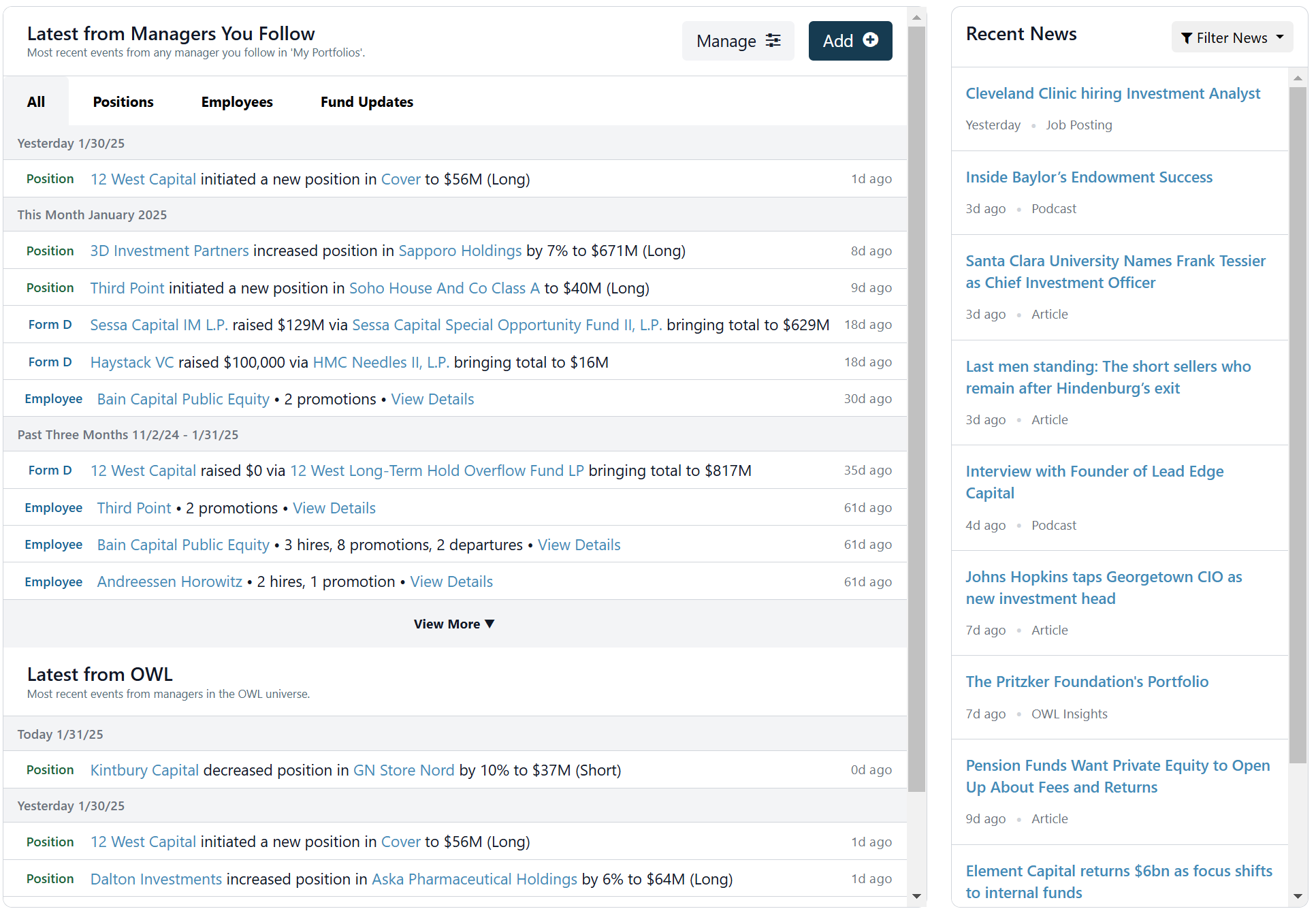 Now, when you log in to OWL , you'll see a personalized feed featuring updates for the managers you follow in your "My Portfolios." If you haven’t set up a My Portfolio yet, we highly recommend doing so - you’ll get a customized experience and start receiving weekly email updates for the managers that matter most to you.