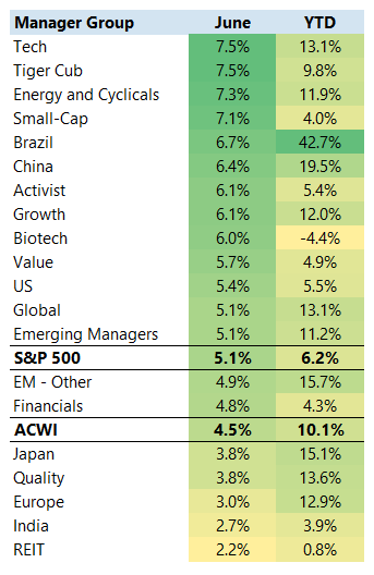 All OWL Groups had positive performance in June, with Tech and Tiger Cubs leading the way. Energy/Cyclicals, Small-Cap, and Brazil also had a strong month. Our Biotech group was up 6% in June but still has the lowest YTD performance across our groups. While still positive, Our India and REIT groups underperformed for the month.
