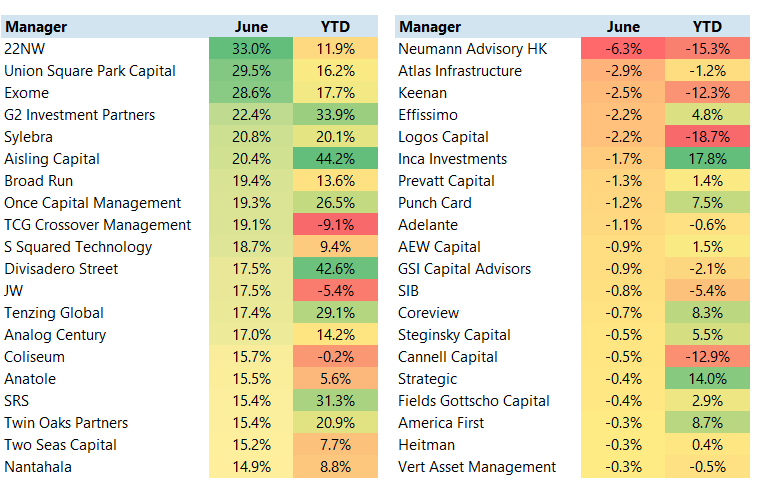 Below is a selection of managers whose disclosed positions had the best and worst estimated performance in June.