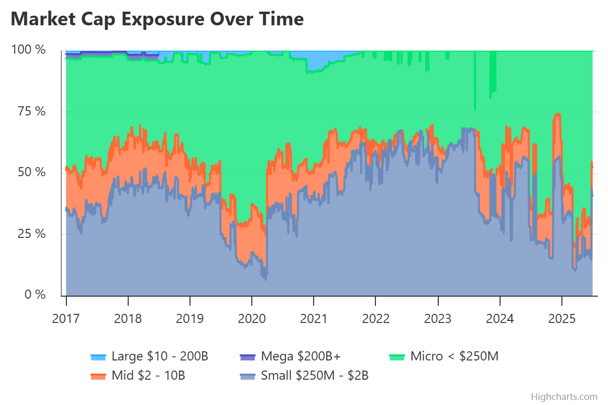 22NW currently discloses 23 positions, mostly in US microcaps. OWL users can look at exposures across several factors including market cap, sector, and geography for thousands of managers on our platform, helping them better understand portfolio and strategy shifts over time.