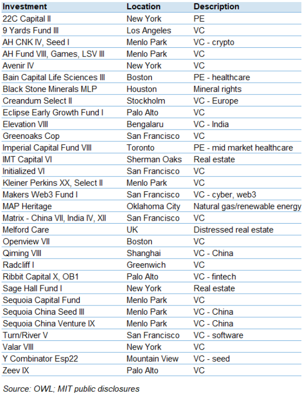In its private portfolio, MIT continues to have a heavy focus on VC investments. Below is a table of new investments made across MIT’s private portfolio during 2022.
