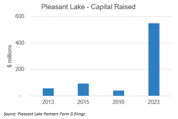 This unique history can be seen in the data from Pleasant Lake’s form D disclosures below. Form Ds are public disclosures where managers report new capital raised each year and are one of the data sets we are working to add to OWL.