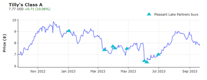 Pleasant Lake’s long portfolio today is heavily invested in small-cap consumer names, the largest of which is a ~$50 million stake in Tilly’s, a specialty retailer. Over the past two years, Pleasant Lake has bought over 20% of the company and has continued to add to its position in recent months. Newtyn , Shay Capital , and Divisar Capital also have meaningful stakes in Tilly’s.