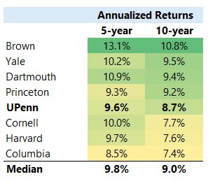 In terms of returns, UPenn falls in the middle of the Ivy League pack, annualizing at 9.6% and 8.7% over the last 5 and 10 years, respectively.