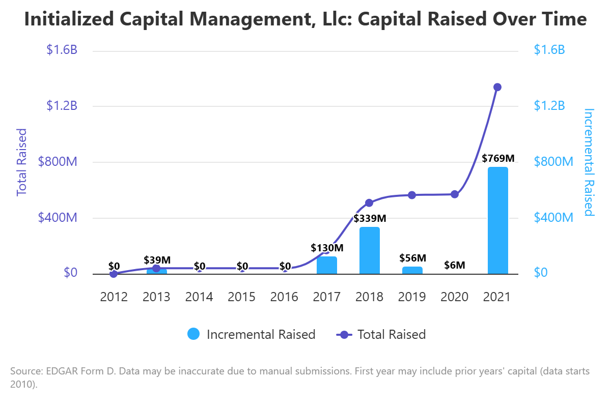 Initialized AUM has grown substantially over the past few years. 2021 was a big fundraising year for the firm, and since then, they have doubled the number of funds and SPVs in their portfolio.