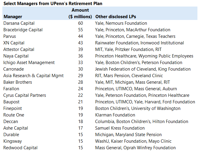 The table below includes a list of managers disclosed in UPenn’s retirement filings, and users can see the full list on UPenn’s profile . As we wrote about in 2023 , CIO Peter Ammon’s background at Yale likely plays a role in the heavy overlap in the two endowments’ portfolios: