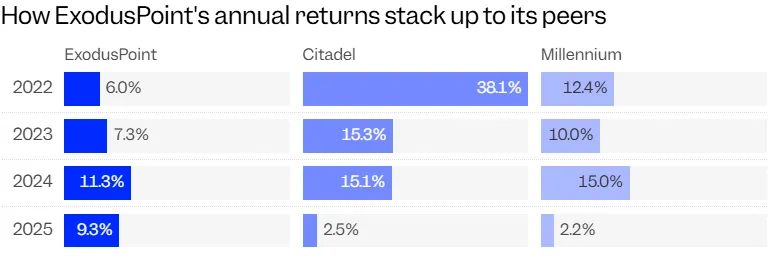 Lastly, the firm has been strategic about how it expands and hires. While headcounts at multistrategy funds have exploded in recent years, ExodusPoint reduced its staff slightly since 2022, according to regulatory filings compiled by industry data tracker Old Well Labs.